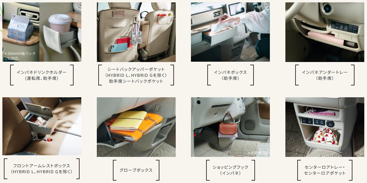 収納スペースは随所に配置され、スマホや小物の定位置がすぐ見つかります。シートアレンジも自在で、フルフラットにすれば車内がくつろぎ空間に早変わりです。
