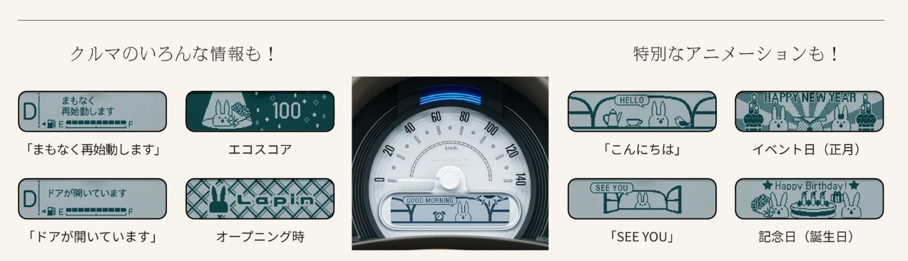ナチュラルで木目調のインパネには、うさぎのアイコンがちょこんと顔を出し、ドアトリムやガーニッシュにもこだわりが光ります。乗るたびに、ちょっと嬉しくなる空間です。