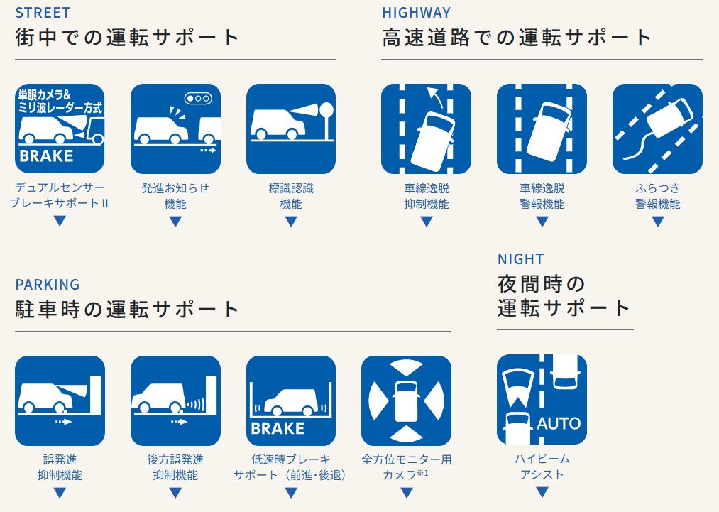 衝突被害軽減ブレーキ「デュアルセンサーブレーキサポートII」や車線逸脱抑制機能、信号の切り替わりを知らせてくれる「発進お知らせ機能」など、運転をしっかりサポートしてくれます。
